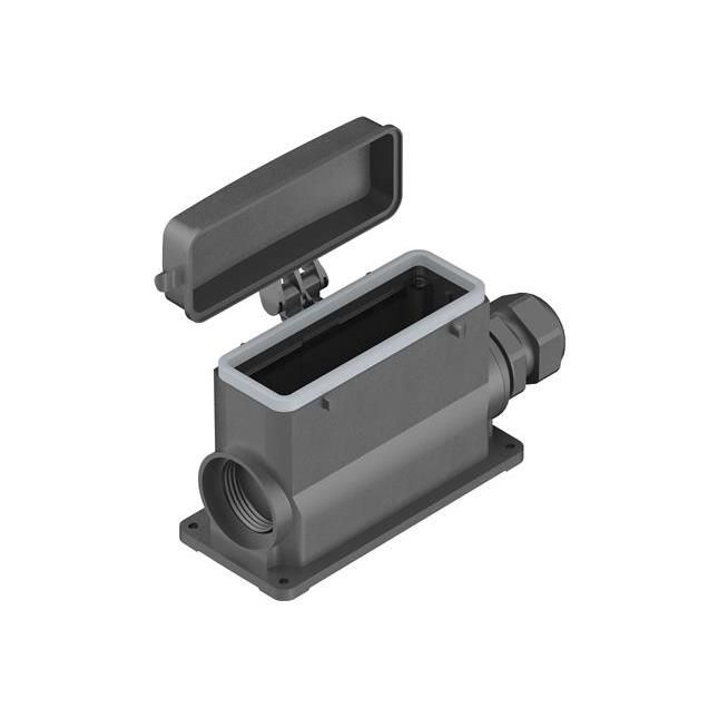 Features a connector type acknowledged as Base - Box Mount. Equipped with features categorized as Cover. Available in Black color for the enclosure to assist in visual recognition. Constructed from Polyamide (PA), Nylon, Glass Filled material to guarantee strength and reliability. Employs Black light type for maximum brightness. Rated with IP IP66 - Dust Tight, Water Resistant to safeguard against dust and moisture penetration. Placement of the lock Locking Clip (2) on Hood for precise alignment. Temperature range -40°C ~ 125°C for environmental conditions impacting thermal efficiency. Type of housing Bulk for safeguarding or transporting components. Product status Obsolete concerning availability and lifecycle. Classification series for the product or component Han-Eco® B. Total dimensions 24B for physical characteristics. Details on package size 5.669" L x 2.559" W x 3.465" H (144.00mm x 65.00mm x 88.00mm) for electrical or mechanical components. Measurement dimensions 5.669" L x 2.559" W x 3.465" H (144.00mm x 65.00mm x 88.00mm) for component specifications. Style variant Side Entry for design or arrangement. Dimension of the thread M32 relevant for screws or bolts.