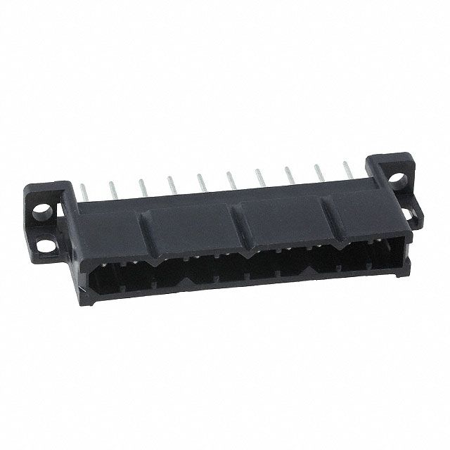 Specifies connector spacing defined as 0.200" (5.08mm) for suitable PCB layout. Features a connector type acknowledged as Receptacle. Offers mating contact finish rated at Tin. Incorporates the length of the post contact specified as 0.185" (4.70mm). Crafted with a contact shape described as Circular. Makes use of a contact type known as Male Pin. Sets the ampere rating to 10A. Utilizes a fastening type recognized as Latch Holder. Equipped with features categorized as Mounting Flange. Available in Black color of insulation for easy identification. An insulation height of 0.911" (23.15mm) provides sufficient electrical clearance. Constructed with Polyamide (PA), Nylon insulation material for durability. Classification UL94 V-0 for adherence to fire safety regulations. Mounting configuration Through Hole for structural stability. Overall number of positions 10 for switches or mechanical components. Occupied positions All for mechanical assembly. Overall rows 1 for setting up matrices or displays. Temperature range -40°C ~ 105°C for environmental conditions impacting thermal efficiency. Type of housing Bulk for safeguarding or transporting components. The distance 0.200" (5.08mm) to achieve correct alignment with the corresponding connector. Product status Active concerning availability and lifecycle. Classification series for the product or component Trident Slimline. Extent of insulation Shrouded - 4 Wall for protective measures. Style variant Board to Cable/Wire for design or arrangement. Termination method Solder for electrical or mechanical connections. Voltage specification 250V for electronic devices.