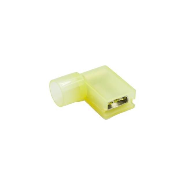 Offered in a shade referred to as Yellow to enhance the system's aesthetics. Includes contact finish plated at Electro-Tin to improve conductivity. Constructed from the contact material known as Brass. Defined with Female gender configuration for connector compatibility. Insulation with a rating of Fully Insulated for safety and efficiency. Mounting configuration Free Hanging (In-Line), Right Angle for structural stability. Type of housing Bag for safeguarding or transporting components. Product status Active concerning availability and lifecycle. Classification series for the product or component BU. The width of the tab 0.032" (0.81mm) for mechanical or electrical connections. The breadth of the tab 0.250" (6.35mm) for connectors or mechanical assemblies. Classification of terminal Angled - 90°, Flag for electrical or mechanical connections. Termination method Crimp for electrical or mechanical connections. Size of wire gauge 10-12 AWG according to electrical standards.
