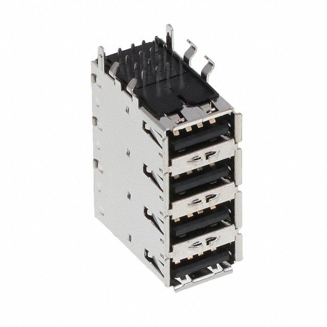 Assesses resistance at forward current Tariff may apply if shipping to the United States for LED or diode testing. Features a connector type acknowledged as USB-A (USB TYPE-A), Stacked. Sets the ampere rating to 1.5A. Equipped with features categorized as Board Lock. Defined with Receptacle gender configuration for connector compatibility. Type of mount Horizontal for easy installation. Mounting configuration Through Hole, Right Angle for structural stability. The total number of contacts is 16 for switches or connectors. Overall number of ports 4 for communication or connectivity. Temperature range -55°C ~ 85°C for environmental conditions impacting thermal efficiency. Type of housing Tray for safeguarding or transporting components. Product status Active concerning availability and lifecycle. Shielding Shielded for EMI/RFI protection. Information USB 2.0 for detailed product data. The classification for import duties Tariff may apply if shipping to the United States related to import and export transactions. Termination method Solder for electrical or mechanical connections. Maximum Vce(on) at Vge Tariff may apply if shipping to the United States for transistor specifications. The operating voltage rating of the device 250VAC.