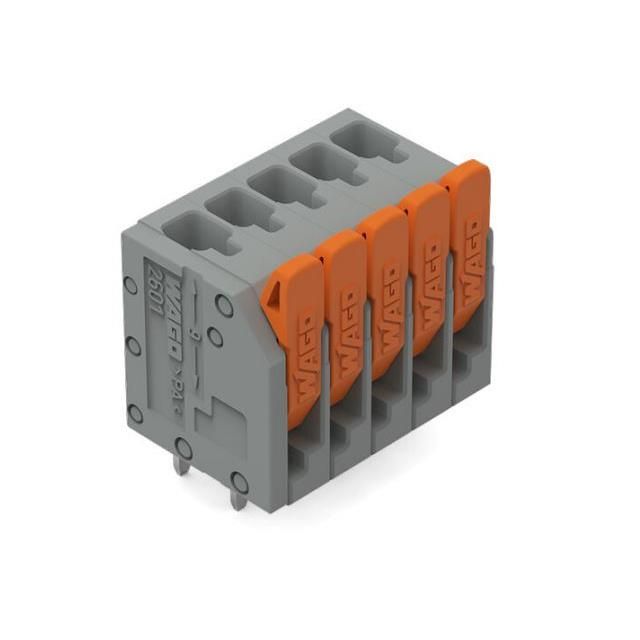 Offered in a shade referred to as Gray to enhance the system's aesthetics. Supports a current specification of 10 A for dependable electrical operation. Facilitates a maximum output current level set as 10 A. Equipped with features categorized as Lever Actuated. Placement of the connector Vertical with Board to ensure proper alignment. Mounting configuration Through Hole for structural stability. Overall levels 1 for multi-tier systems. Type of housing Box for safeguarding or transporting components. Distance 0.138" (3.50mm) for arranging components or aligning connectors. Positions available at each tier 5 for mechanical or electrical configurations. Product status Active concerning availability and lifecycle. Classification series for the product or component 2601. The voltage specification 300 V for electrical parameters. Size of wire gauge 16-26 AWG according to electrical standards. Wire termination Screwless - Leg Spring, Push-In Spring for connection type.