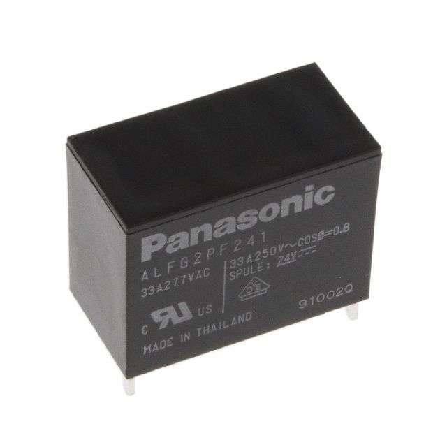 Complies with the criteria of entities acknowledged as cURus, VDE. Supports coil current measured at 58.6 mA. Includes coil insulation rated at Class F to ensure thermal and electrical reliability. Designed with a coil type classified as Non Latching for optimal electrical efficiency. Operates with a coil voltage of 24VDC for reliable functionality. Utilizes a contact configuration categorized as SPST-NO (1 Form A). Constructed from the contact material known as Silver Tin Oxide (AgSnO). Supports a contact current rating of 33 A. The maximum switching load 8250VA for enhanced circuit performance. Mounting configuration Through Hole for structural stability. Needs a voltage of 16.8 VDC for effective activation. Requires a release voltage of 2.4 VDC for reliable functioning. Time duration 20 ms for the response upon activation. Temperature range -40°C ~ 60°C for environmental conditions impacting thermal efficiency. Type of housing Bulk for safeguarding or transporting components. Product status Active concerning availability and lifecycle. Configuration of relay General Purpose for controlling electrical circuits. Duration required 10 ms for reset and reaction. Classification series for the product or component ALFG. The switch's voltage specification 250VAC - Max as per electrical regulations. Type of termination PC Pin for connector or device.