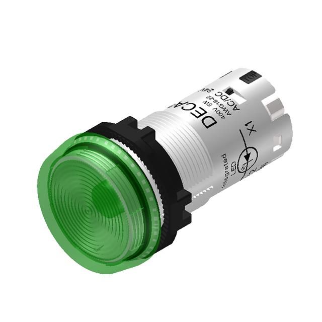 Supports a current specification of 2.2mA for dependable electrical operation. Facilitates a maximum output current level set as 2.2mA. Rated with IP IP30, IP66 to safeguard against dust and moisture penetration. Bulb emits Green color for efficient lighting. Lens color Green for improved visual clarity or signaling. Lens dimensions 29.90mm Dia for proper fitting and application. Lens configuration Round with Flat Top combining utility with aesthetic appeal. Lens transparency Diffused ensuring maximum light passage. Type of housing Box for safeguarding or transporting components. Specifications of the cutout 0.88" (22.30mm) for accurate mounting. Shape of the cutout Round for installation guidelines. Product status Active concerning availability and lifecycle. Criteria AC/DC for electrical, mechanical, or environmental performance. Type of termination Screw Terminal for connector or device. Type classification LED for specifications. The voltage specification 24V for electrical parameters.