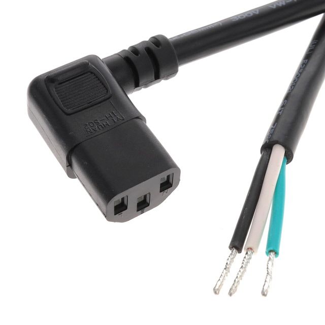 Incorporates a primary connector designed to meet IEC 320-C13, Right Angle requirements. Fitted with a secondary connector designed to Cable standards. Marked with approvals indicated as UL to guarantee adherence to regulations. Permitted for use in locations identified as United States. Offered in a shade referred to as Black to enhance the system's aesthetics. Employs a cord type classified as SJT. Sets the ampere rating to 18A. Overall length 6.56' (2.00m) for size indication. The total number of conductors is 3 for wiring or cabling configurations. Temperature range 60°C for environmental conditions impacting thermal efficiency. Type of housing Box for safeguarding or transporting components. Product status Active concerning availability and lifecycle. Shielding Unshielded for EMI/RFI protection. Style variant Female Sockets (Slots) to Leads for design or arrangement. Voltage specification 250V for electronic devices. Size of wire gauge 14 AWG according to electrical standards.