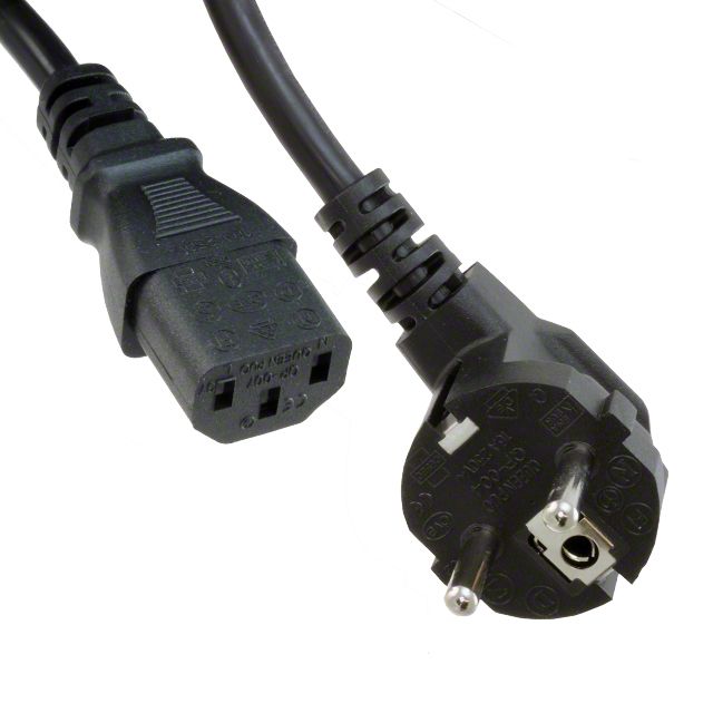 Incorporates a primary connector designed to meet CEE 7/7, Right Angle requirements. Fitted with a secondary connector designed to IEC 320-C13 standards. Marked with approvals indicated as VDE to guarantee adherence to regulations. Permitted for use in locations identified as Germany. Assesses resistance at forward current Tariff may apply if shipping to the United States for LED or diode testing. Offered in a shade referred to as Black to enhance the system's aesthetics. Employs a cord type classified as H05VV-F3G0.75. Sets the ampere rating to 10A. Overall length 6.56' (2.00m) for size indication. The total number of conductors is 3 for wiring or cabling configurations. Temperature range -40°C ~ 70°C for environmental conditions impacting thermal efficiency. Type of housing Bulk for safeguarding or transporting components. Product status Active concerning availability and lifecycle. Shielding Unshielded for EMI/RFI protection. Style variant Male Pins (Blades) to Female Sockets (Slots) for design or arrangement. The classification for import duties Tariff may apply if shipping to the United States related to import and export transactions. Maximum Vce(on) at Vge Tariff may apply if shipping to the United States for transistor specifications. Voltage specification 250VAC for electronic devices. Size of wire gauge 18 AWG according to electrical standards.